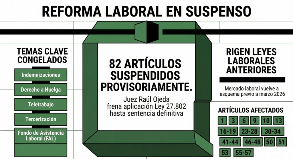La resolución, de un alcance técnico profundo, afecta directamente la columna vertebral de la modernización laboral pretendida por el Ejecutivo. Entre los puntos suspendidos destacan el artículo 55, referente al sistema de actualización de créditos laborales, y diversas modificaciones a la Ley de Contrato de Trabajo (LCT) que alteraban el principio de irrenunciabilidad y la regla de in dubio pro operario. Asimismo, quedaron en suspenso las normativas sobre responsabilidad solidaria en tercerizaciones y el régimen de pago en cuotas de sentencias judiciales.
